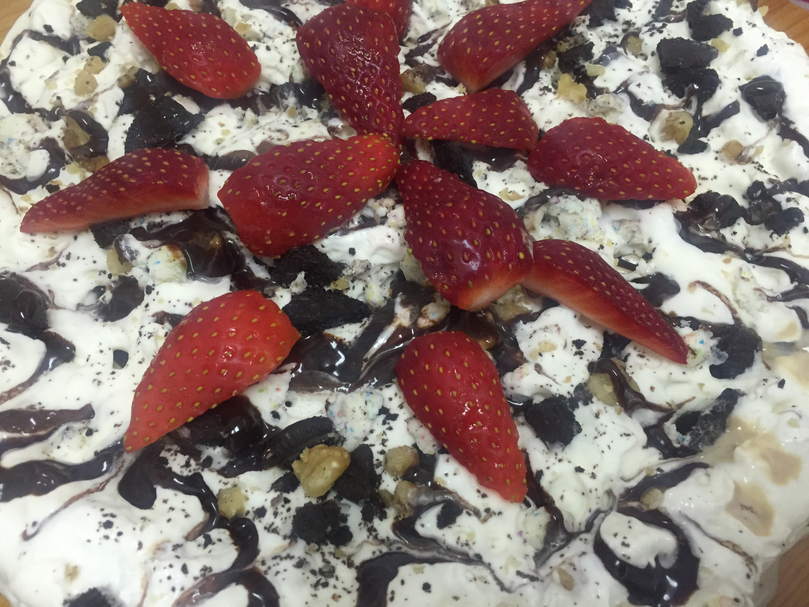 thawed whipping cream and sprinkle cookie crumbs,walnuts , chocolate syrup and strawberries.