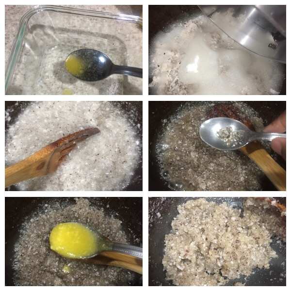 Grate the coconut and dry grind it in mixer into fine crumbs.