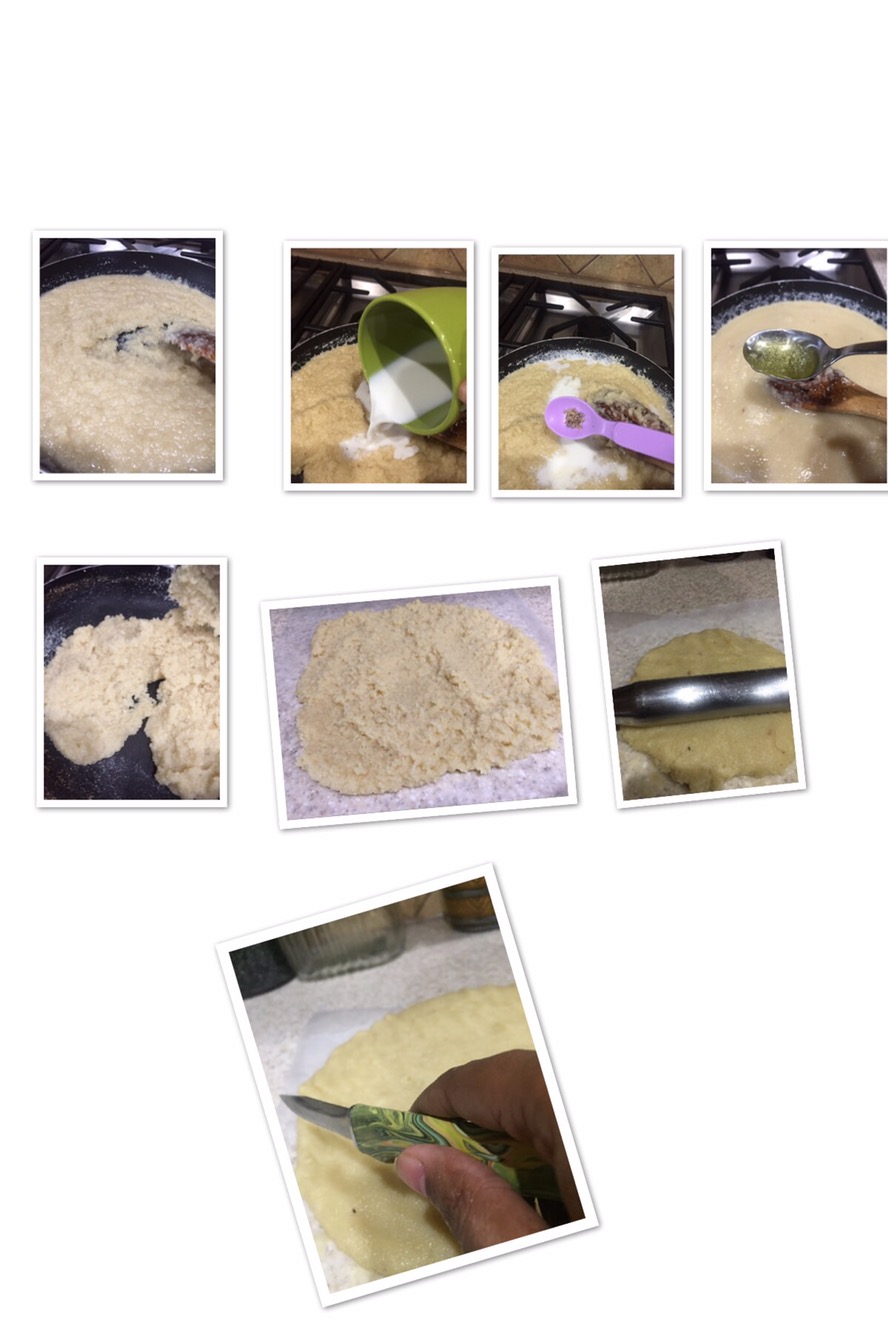 Switch of the stove and spread on a greased (with ghee) parchment paper to cool for 10 minutes.
