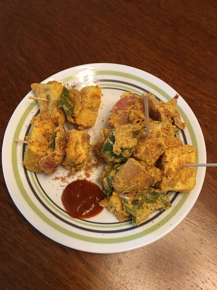 Paneer Tikka is a Indian dish, prepared with paneer (cottage cheese), capsicum, onions.marinated with Indian spices and squeezed some lemon juice.grilled in hot tawa or oven by arranging marinated cheese and vegetables In a stick.