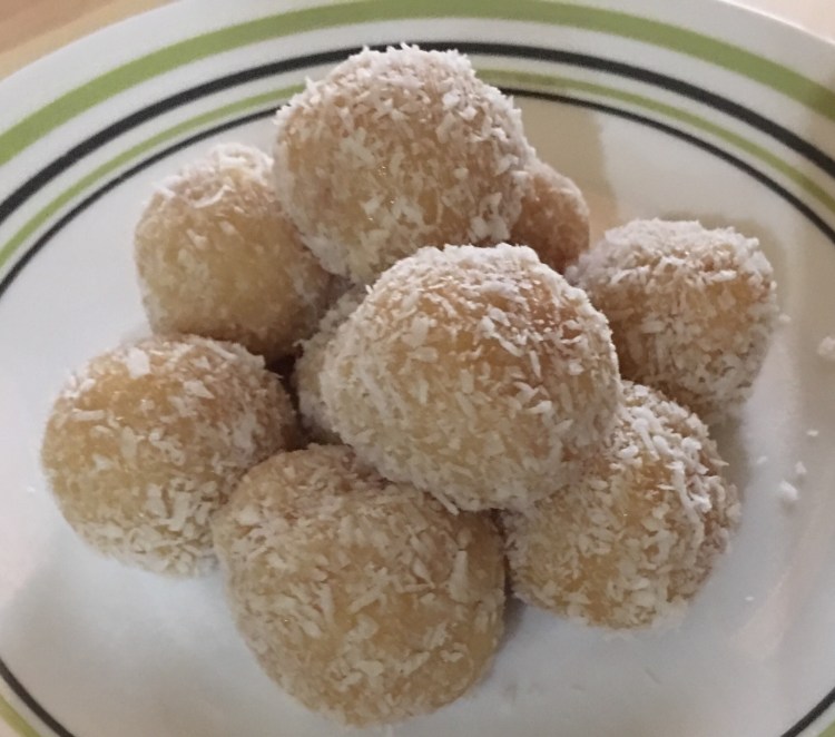Take out ,make lemon sized balls of the mixture and roll onto the coconut flakes.