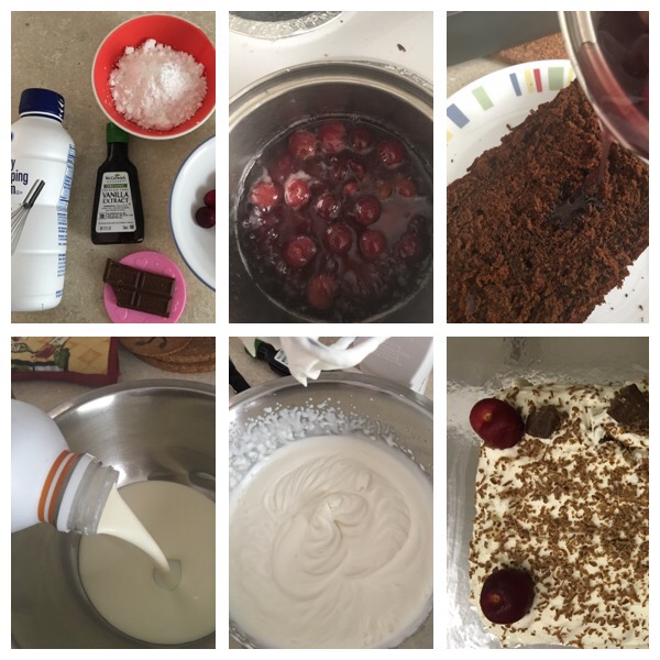 Spread the whipped cream on top of one layer and add some cherries.close the layer with another layer and cover the whole cake with whipped cream.